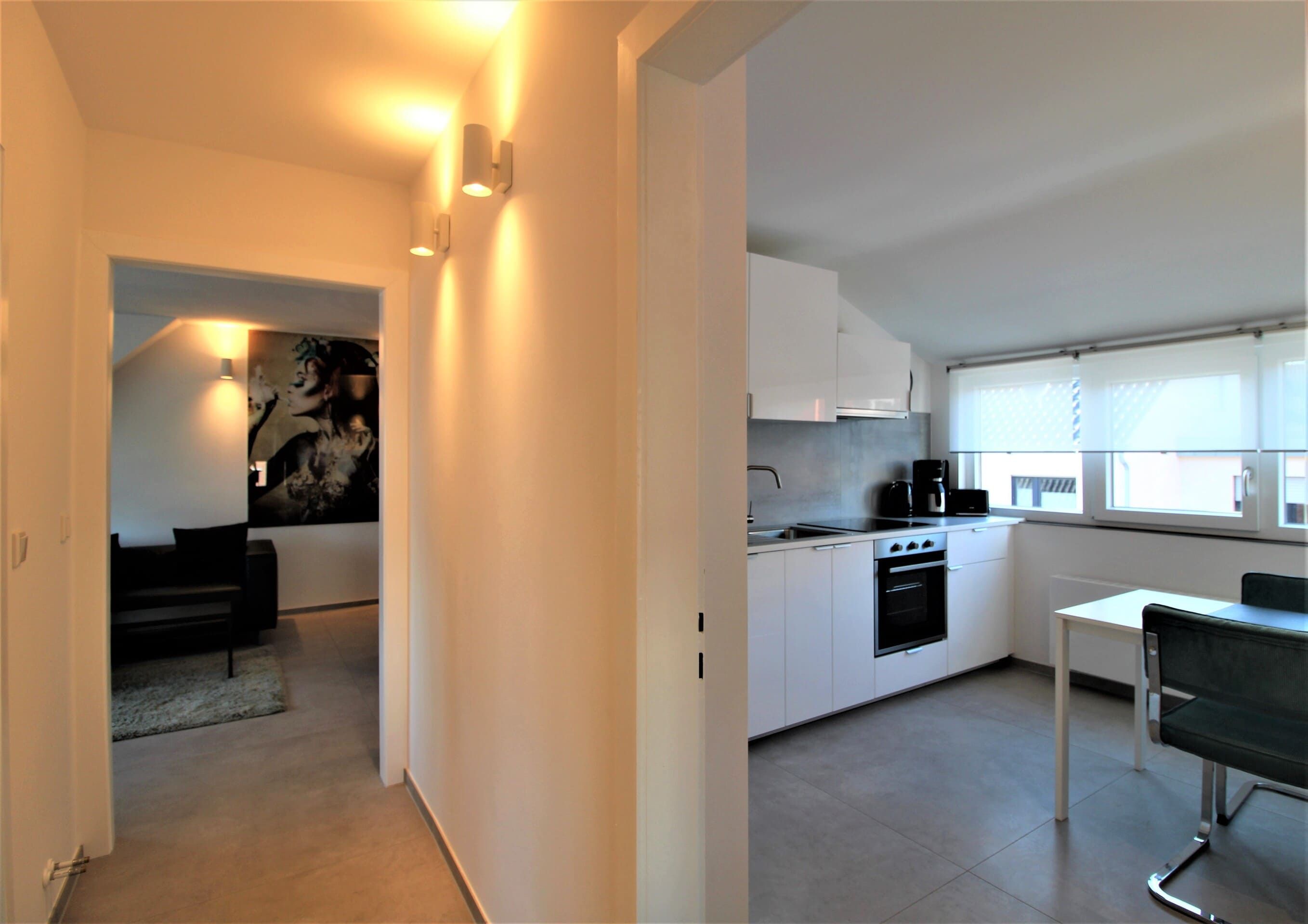 Die ca. 44 qm große Wohnung im Obergeschoss (von uns Wohnung „Colin“ getauft) ist eine Nichtraucherwohnung und verfügt über ein Wohnzimmer, eine moderne Küche, einen Essbereich, ein separates Schlafzimmer und ein schönes Bad.